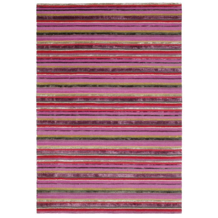 Dynamischer Streifen, zwischen geschnittenem Velours und Bouclé alternierend. Wolle und Viskose, handgewoben.
